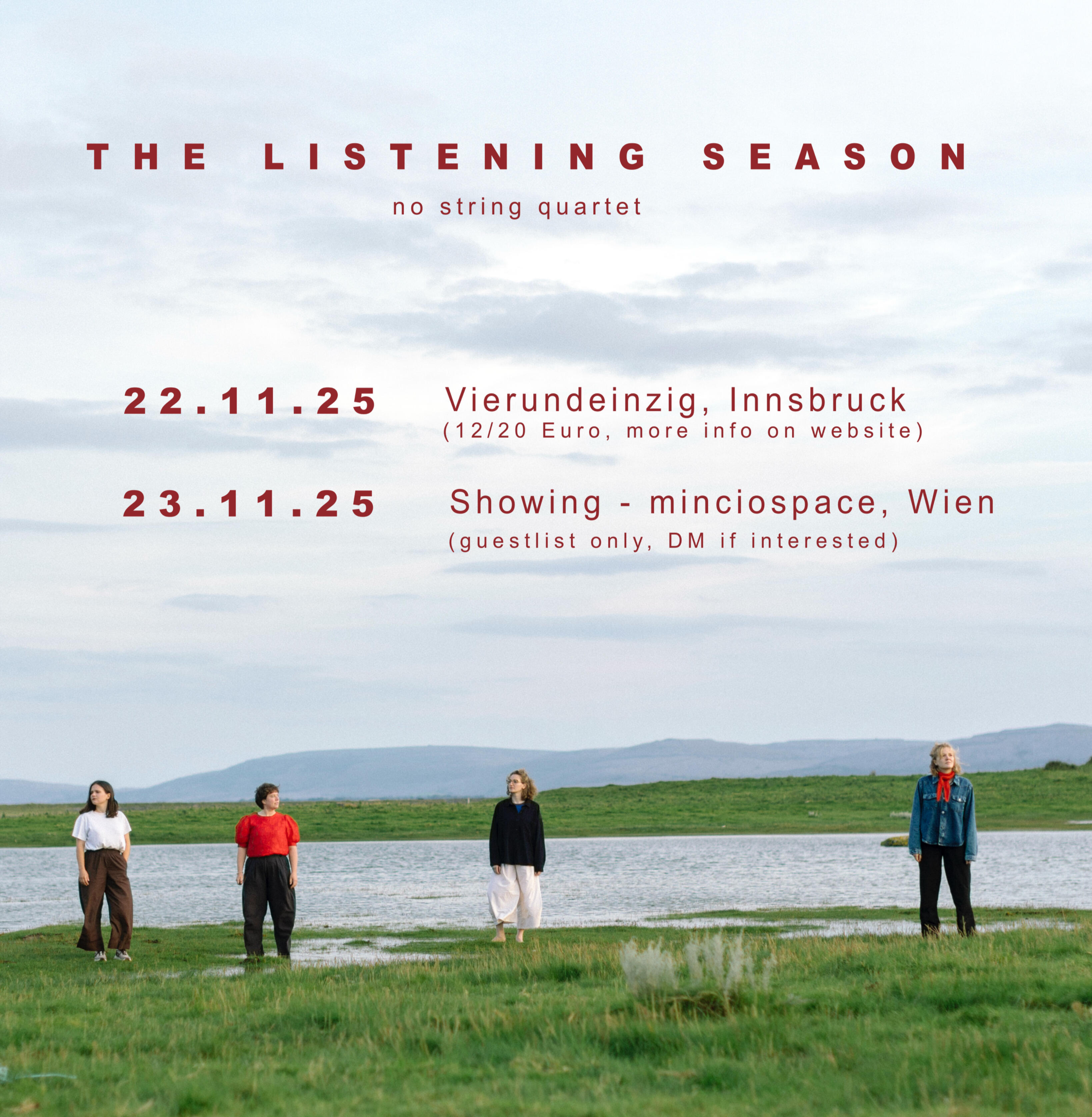 Gemeinsam widmen sich die Musikerinnen einer ganz besonderen Klangfindung der unterschiedlichen aber doch so verbundenen Instrumente und ihren Stimmen. Die Idee?Die Gattung „Streichquartett“ genauer zu beleuchten, die Vorteile dieses 4-stimmigen Satzes mitzunehmen in neue Welten der Komposition, des Arrangements und des gemeinsamen Musizierens. Außerdem: Genres werden aufgebrochen, die Musik des Ensembles bedient sich sowohl klassischer, als auch zeitgenössischer, Volks-, Jazz- und Weltmusik sowie Elementen der Improvisation und schafft so eine einzigartige Klangsprache und Atmosphäre.Das no string quartet wurde im Jahr 2024 gegründet und konzertierte bereits in namhaften Locations und Festivals (Sargfabrik Wien, musikalischer Adventskalender Wien, Outreach Music Festival, etc.). Für das Jahr 2025 ist die Veröffentlichung der ersten EP geplant, gefolgt von einer Konzertreihe im Jahr 2026 in Zusammenarbeit mit dem Wiener Konzerthaus.